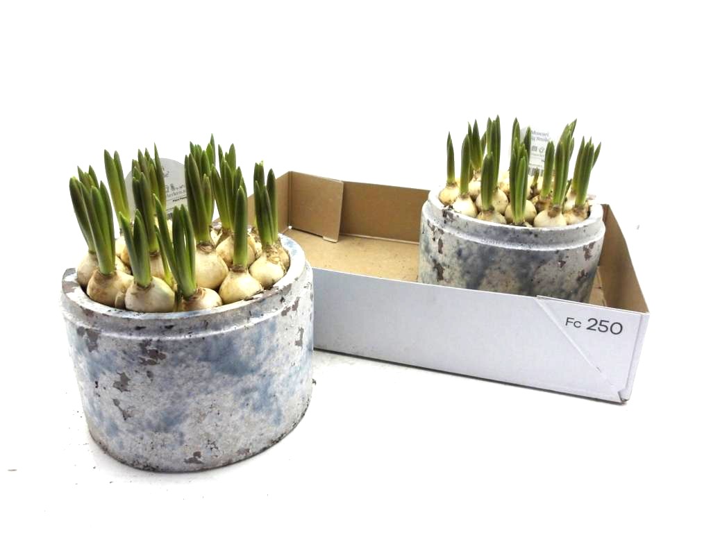 Muscari in Steintopf blaugrau